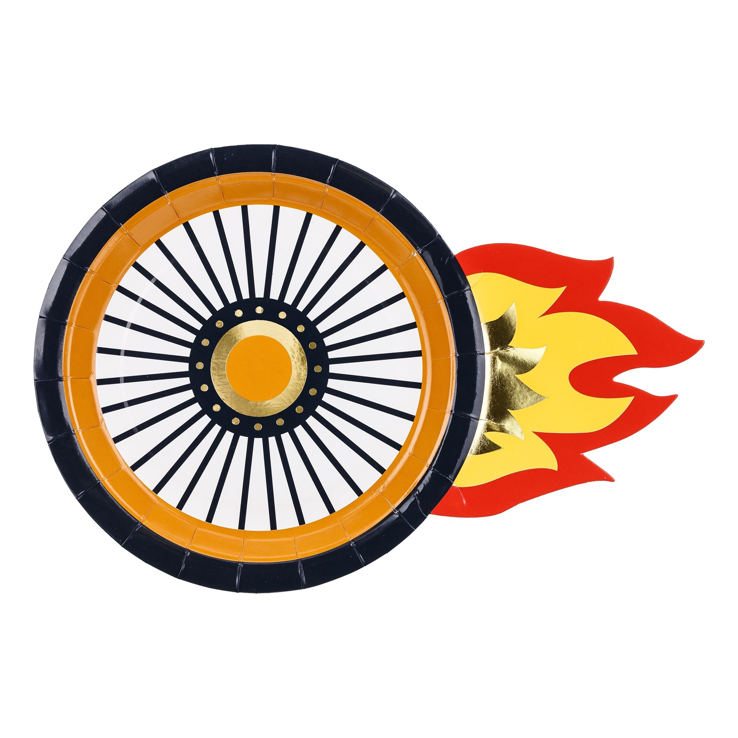 Papperstallrikar Hjul innehåller 6 stycken tallrikar i papper som alla mäter 26.5 x 18 cm och föreställer däck med flames. En perfekt detalj på fartfyllda barnkalas!