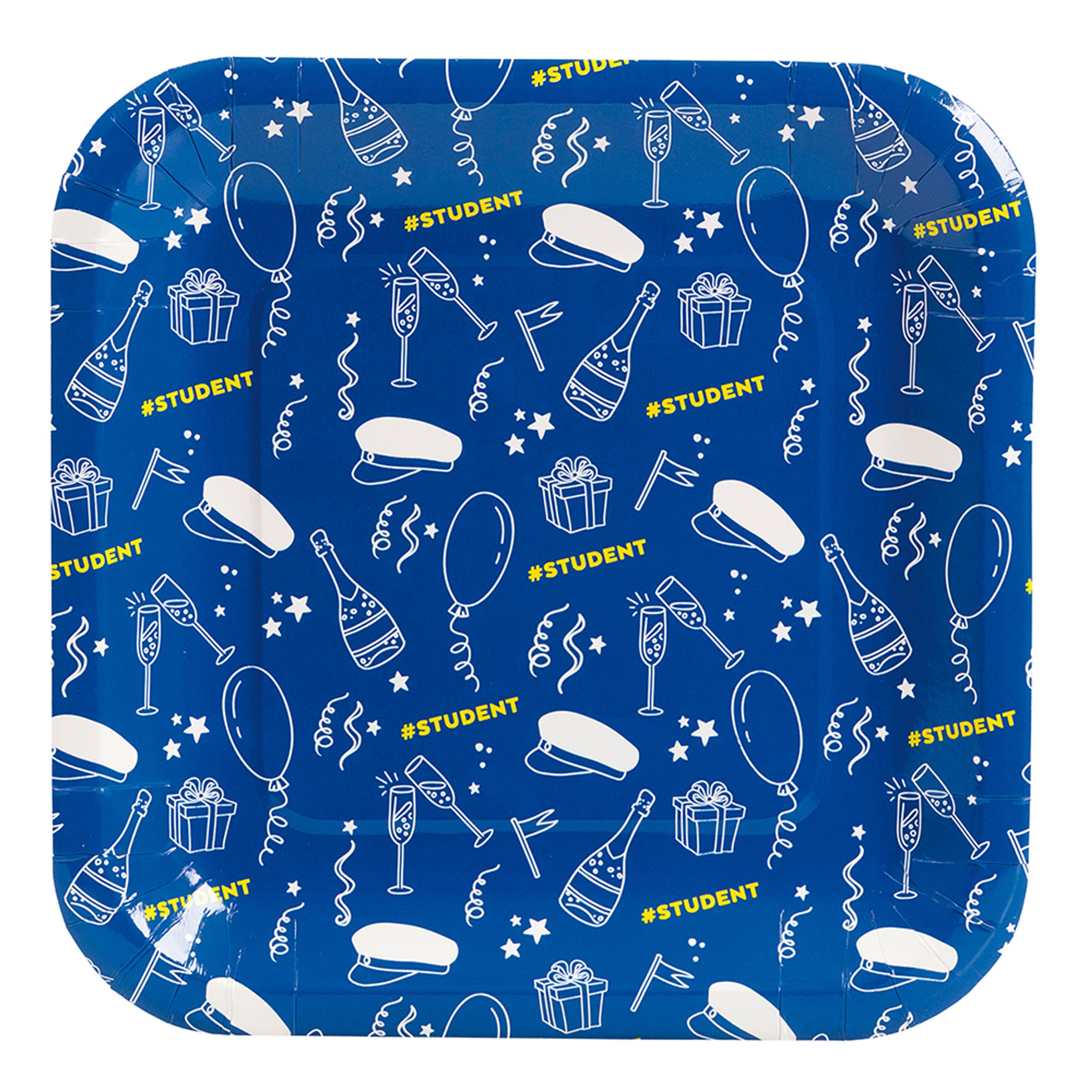Papperstallrikar Kvadratiska Student levereras som ett 8-pack och innehåller kvadratiska papperstallrikar i blå färg. Varje tallrik mäter cirka 22 cm stor.