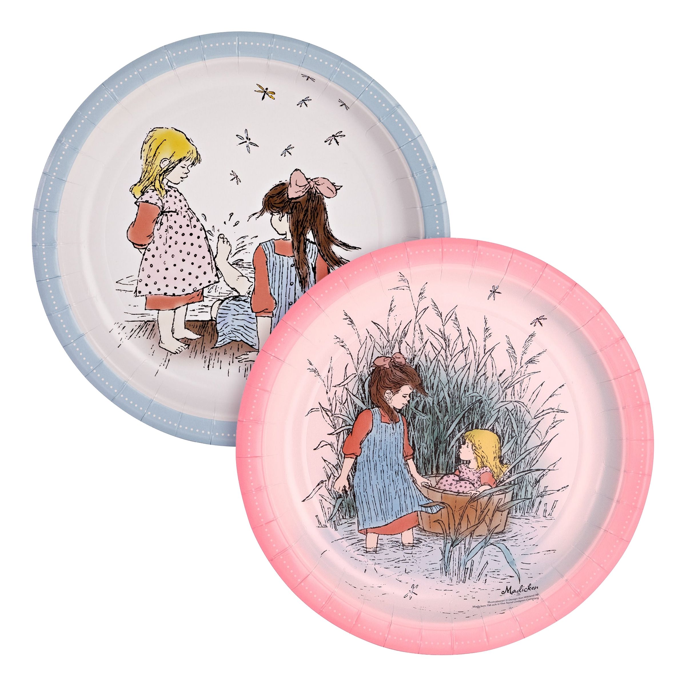 Papperstallrikar Madicken inkluderar åtta stycken engångstallrikar i två olika färger, blå och rosa, som samtliga kommer med motiv hämtat från Astrid Lindgrens Madicken. Komplettera gärna med annan dukning ur samma kollektion för ett fullbordad tema på barnkalaset.