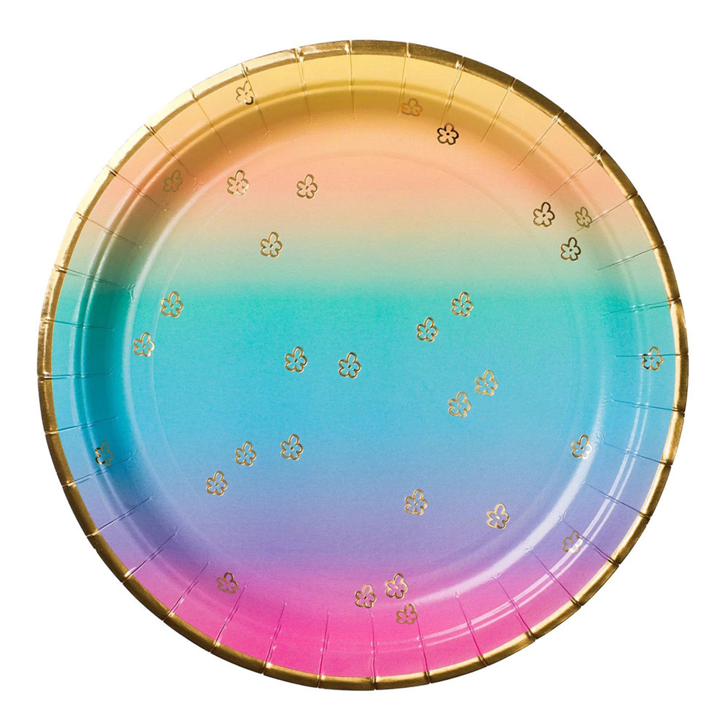 Papperstallrikar Ombre inkluderar åtta stycken ombréfärgade papperstallrikar i färgerna gul, blå, grön och rosa med guldiga blommor och guldkant. De här tallrikarna passar perfekt att duka upp kalasbordet med och kommer få alla på extra glatt humör!