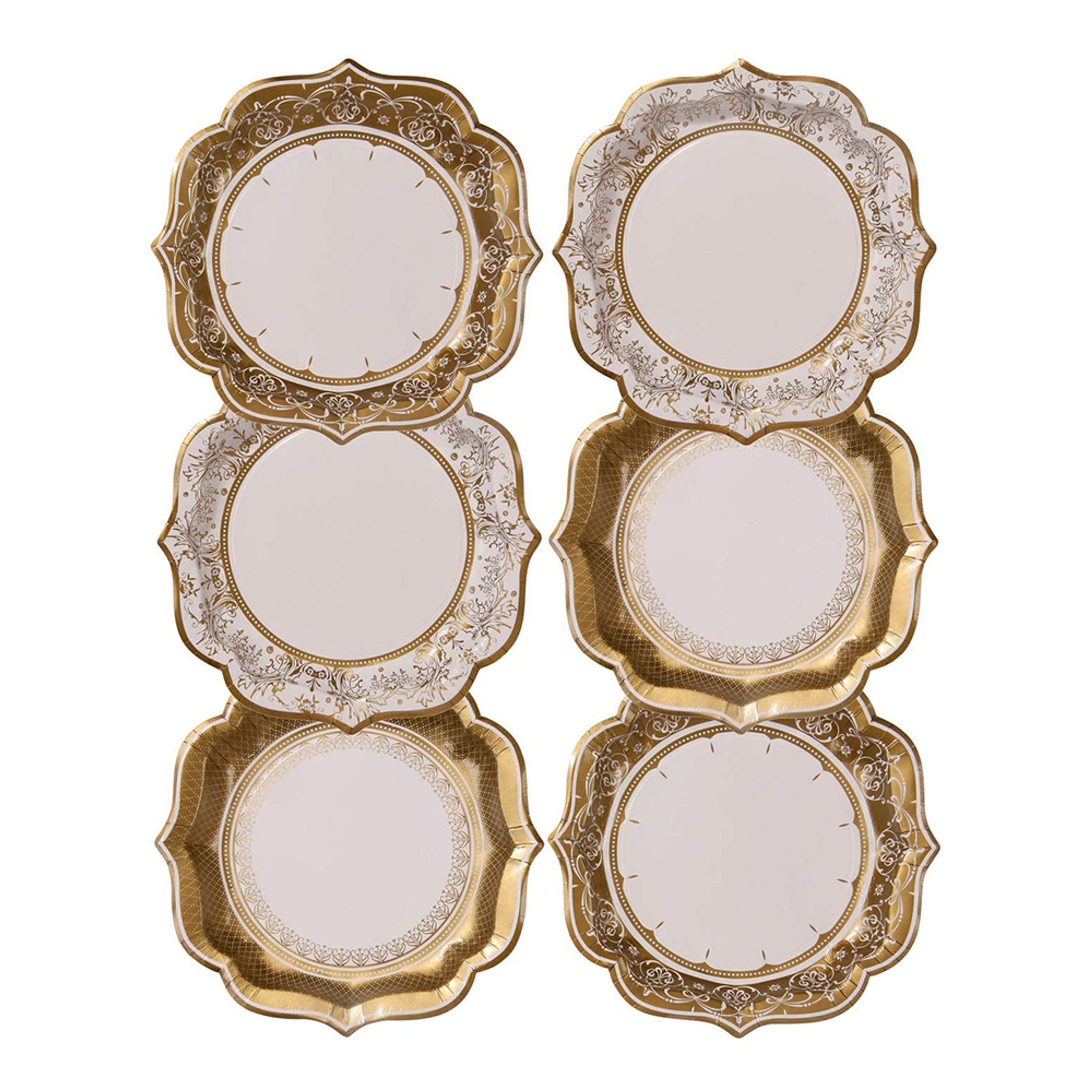 När du vill duka upp ett vackert festbord men är rädd för att använda det riktiga finporslinet har du lösningen här. Eleganta papptallrikar med guldfärgat mönster! Bordet kommer att se fantastiskt ut, inget kan gå sönder och du slipper disken!