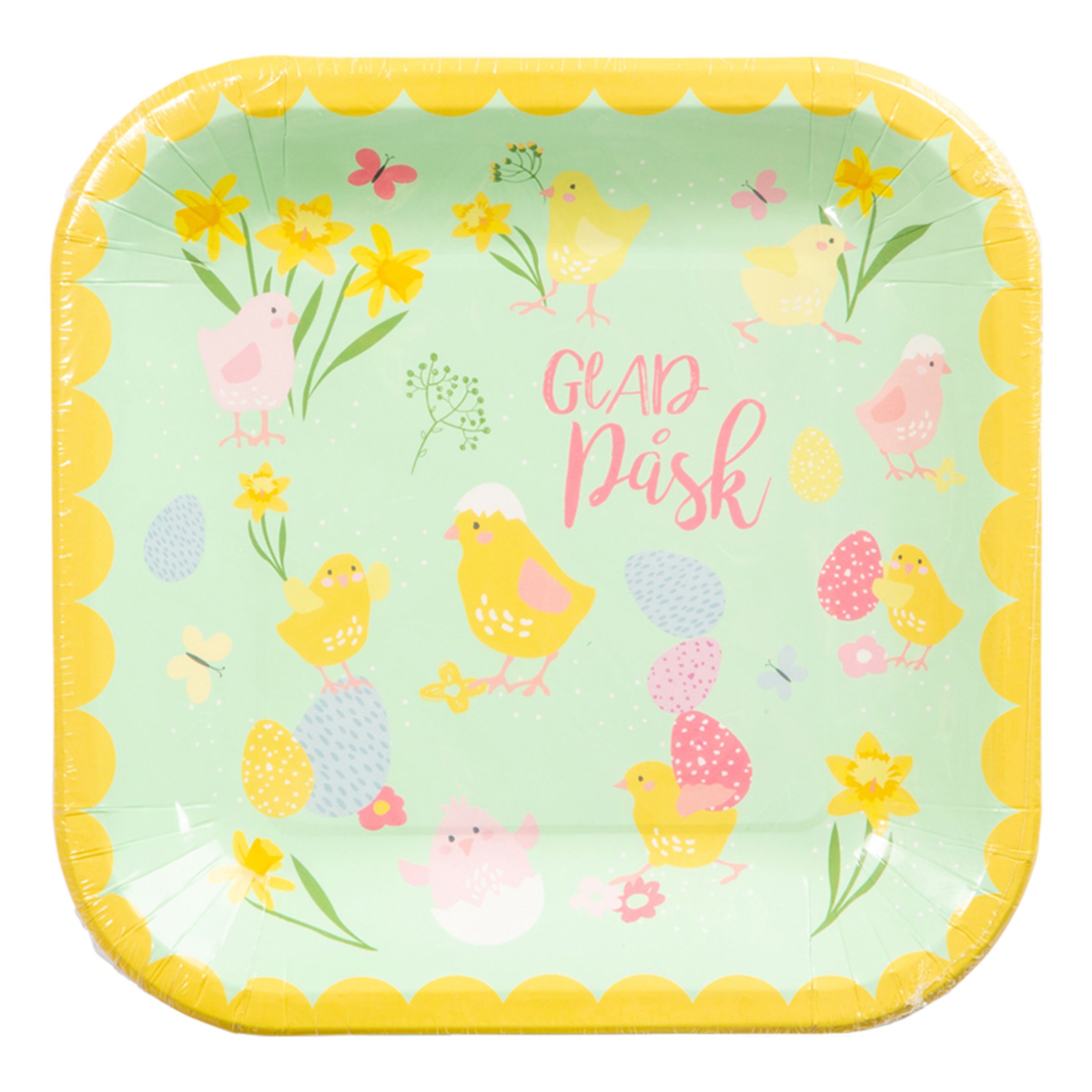 Papperstallrikar Påskkycklingar & Ägg inkluderar åtta stycken tallrikar i papp. Tallrikarna är fyrkantiga med rundade hörn. På de pastellfärgade tallrikarna finns ett gulligt motiv på kycklingar, ägg och blommor och på tallrikarna står det även "Glad påsk". Tallrikarna är 23 cm stora.
