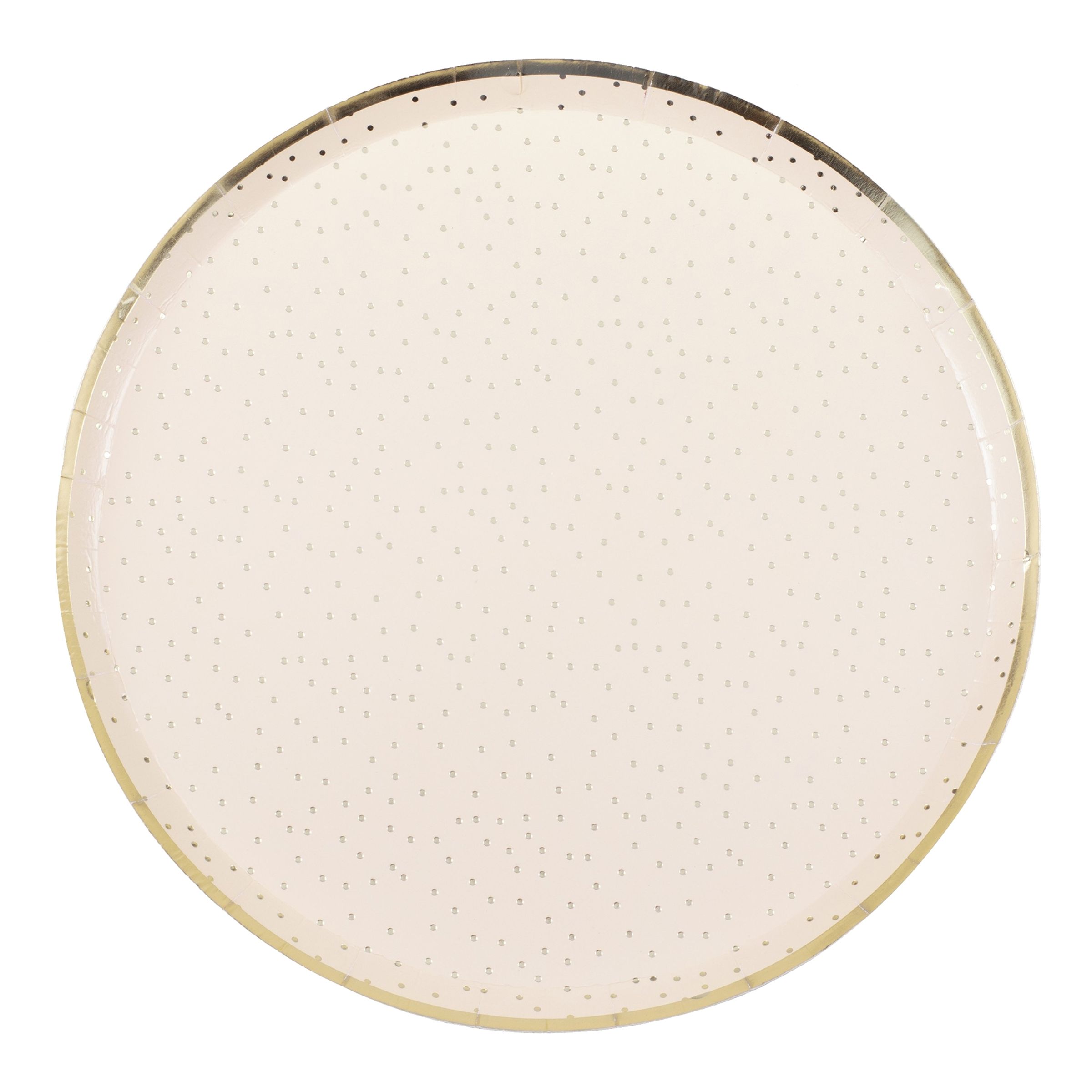 Papperstallrikar Peach med Prickar är runda engångstallrikar i ljus persiko-färg med guldig kant och prickar. Förpackningen innehåller 8 tallrikar i storleken 25cm i diametern.