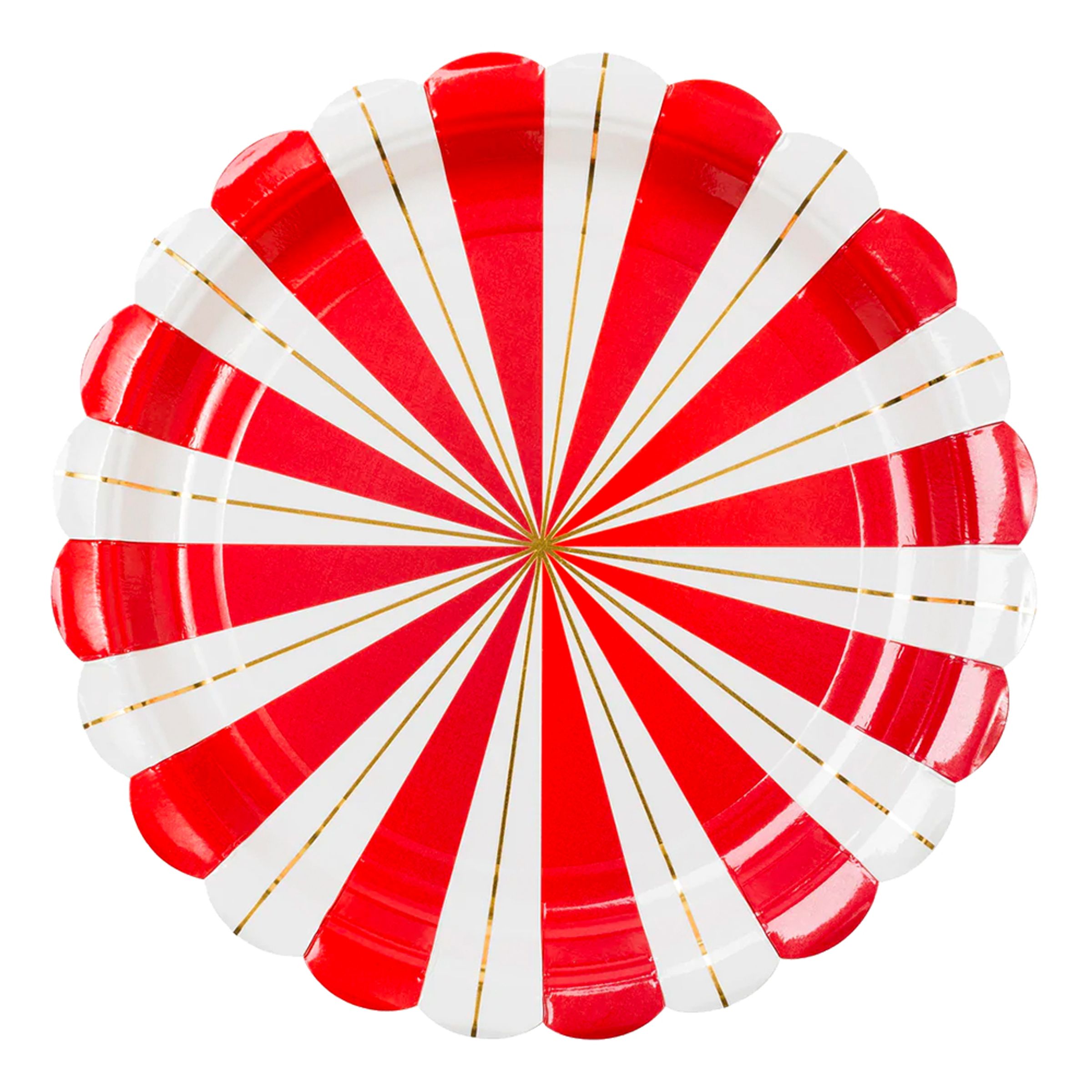 Papperstallrikar Röd/Vit Randiga är vit- och rödrandiga jultallrikar med guldfärgade linjer. Perfekta för en matchande och enhetlig juldukning, eller till kalaset med cirkus som tema. Köp gärna till resterande artiklar i samma julserie för matchande servering.