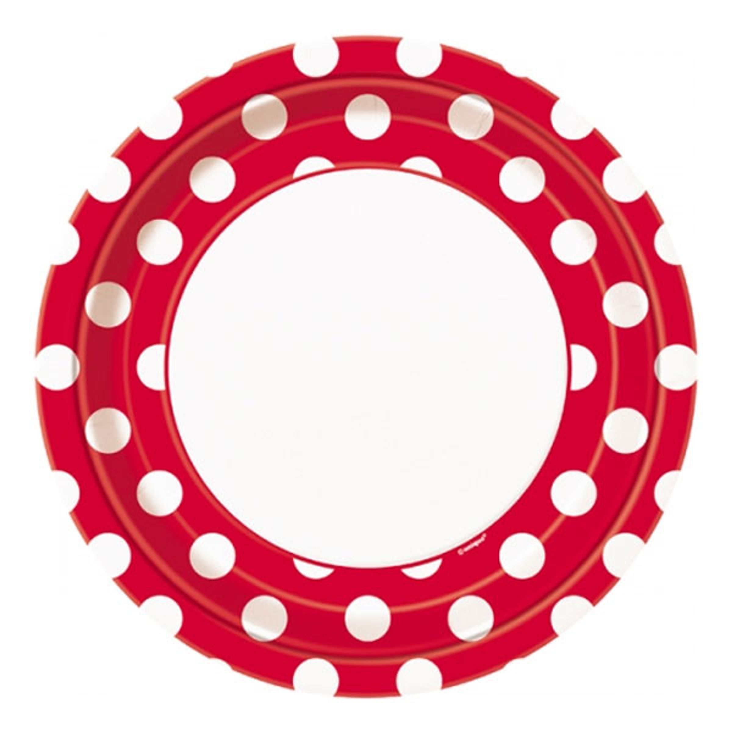 Papperstallrikar Röda Prickiga säljes i 8-pack och mäter 23 cm stora.
