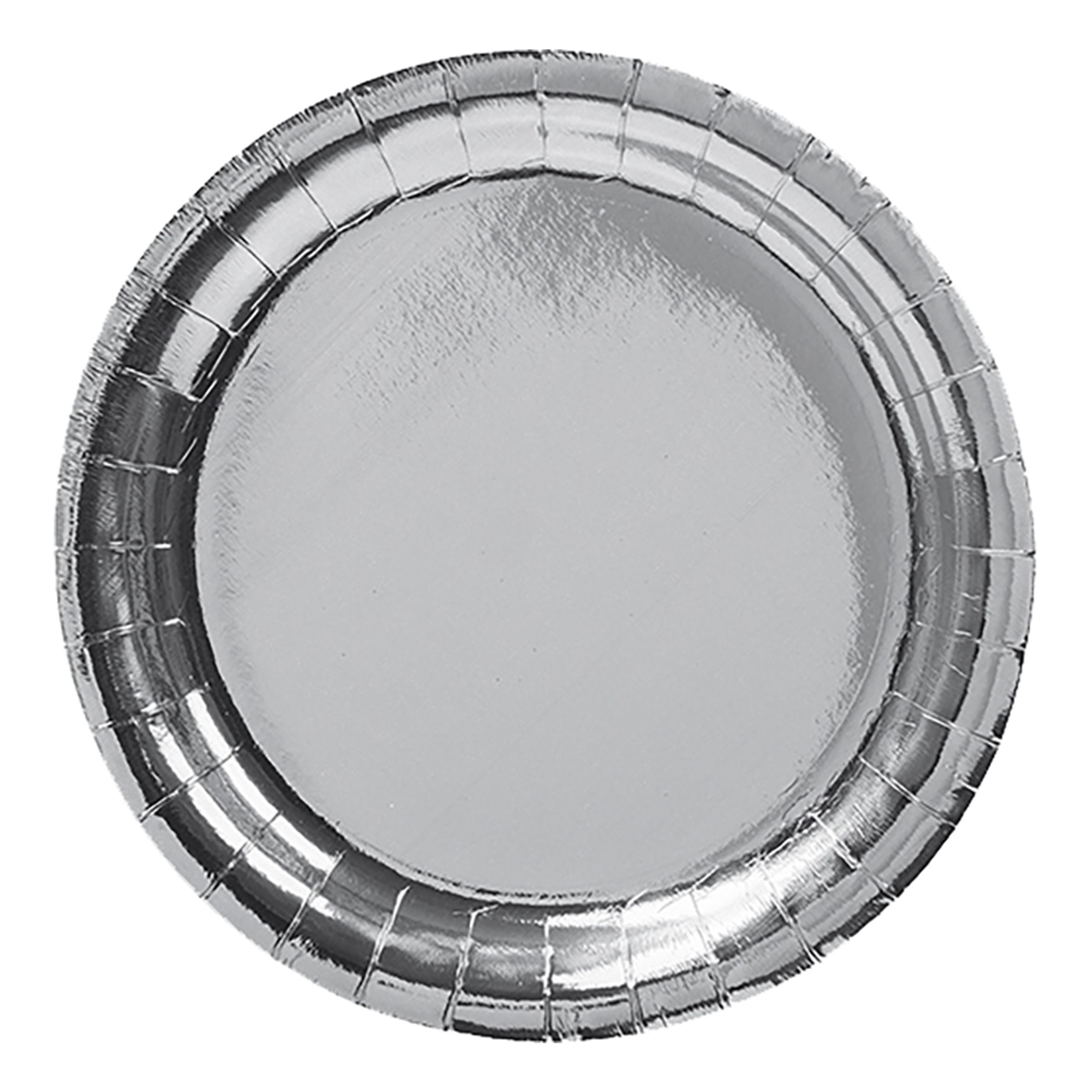 Med de här silverfärgade tallrikarna dukar du snabbt och enkelt upp ett festligt kalasbord. Silvertallrikarna ger dukningen en festlig och lyxig karaktär och de kan användas vid många olika tillfällen, allt från födelsedagskalas till nyårsfester och discon. Silver är en elegant färg som enkelt kan matchas med andra festdekorationer i olika färger.