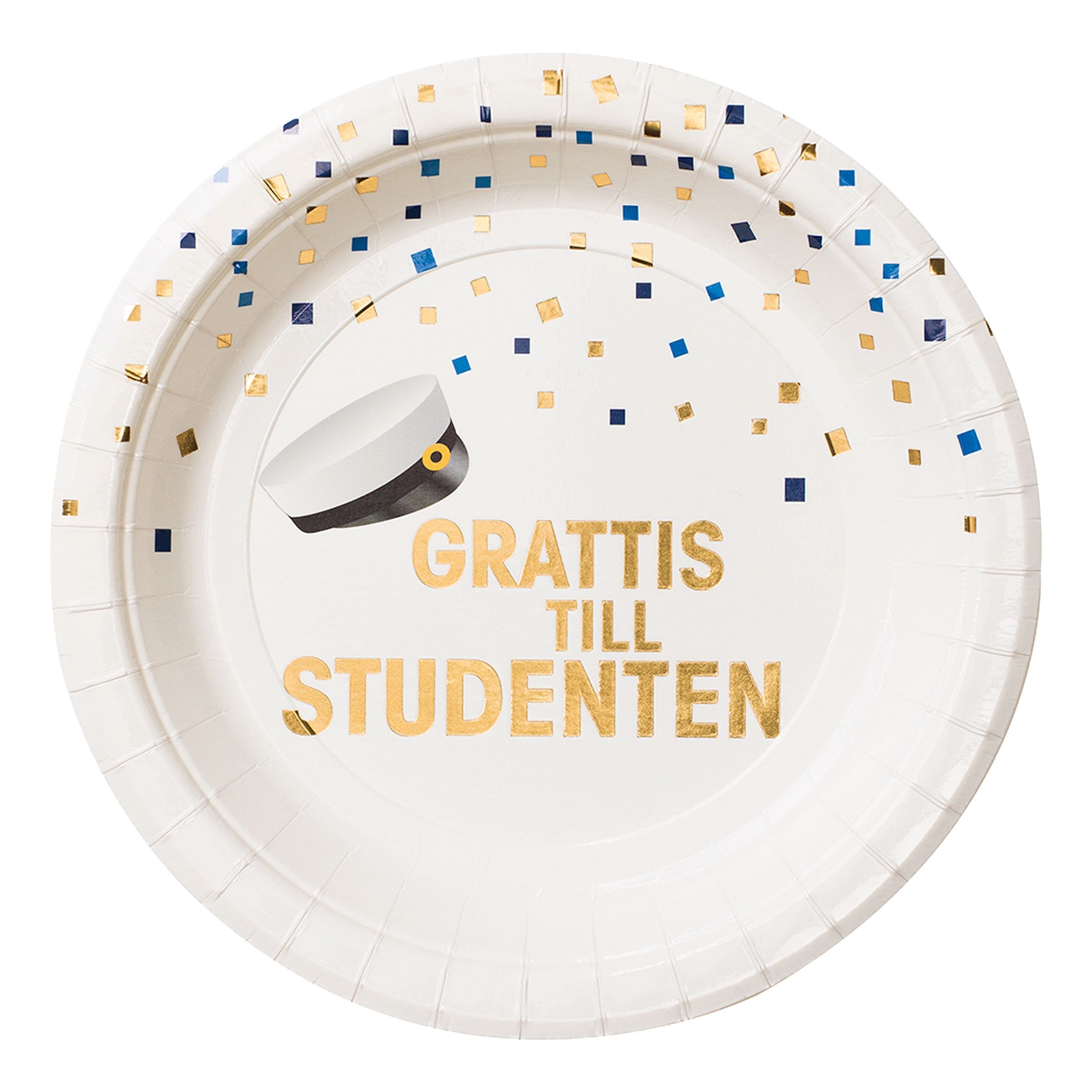 Papperstallrikar Studenten Guldfolie är vita engångstallrikar med festligt motiv av konfetti och "Grattis till studenten" tryckt i skimrande guld metallic.