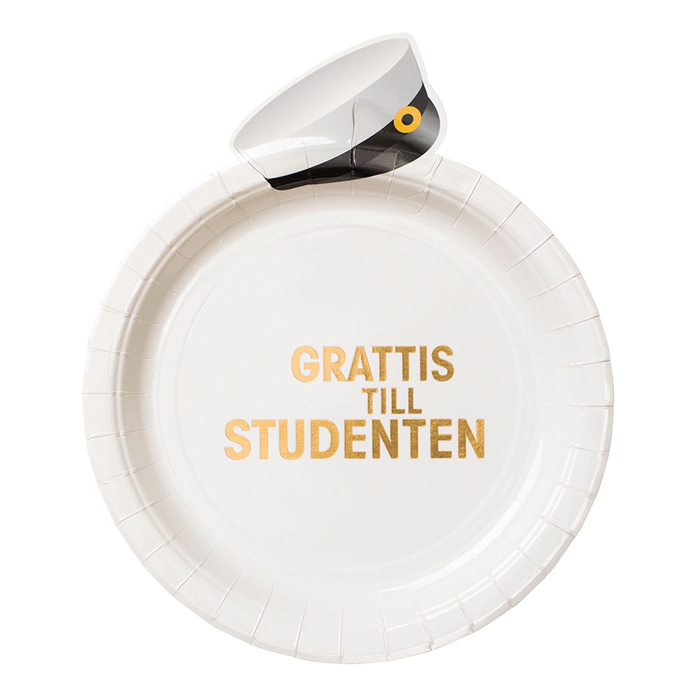 Papperstallrikar Studentmössa är vita papptallrikar tryckt med texten "Grattis till studenten" i skimrande guld metallic, med en studentmössa på kanten. Superfestliga!
