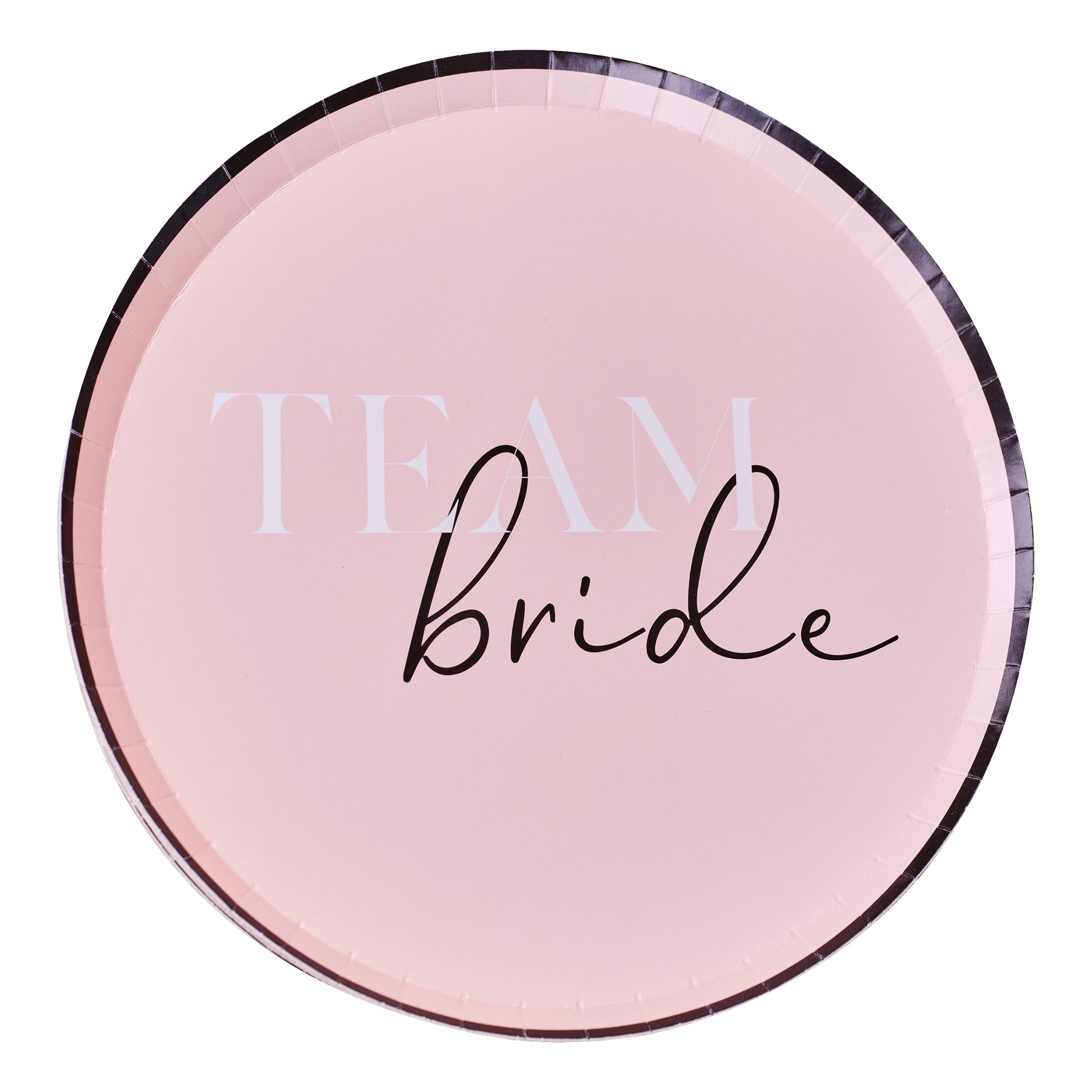 Papperstallrikar Team Bride får du 8 runda papperstallrikar i färgen rosa med svarta kanter samt har texten '' Team Bride ''. Perfekta att duka med till en möhippa!