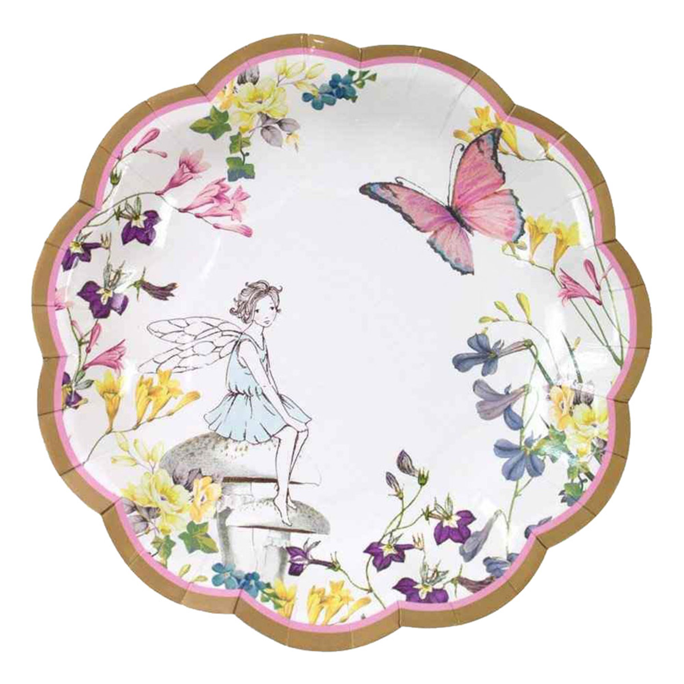 Papperstallrikar Truly Fairy inkluderar tolv stycken vita tallrikar med en vågig kant. Tallrikarna är dekorerade med ett tryck med blommor i olika färger, en fjäril och en älva. De är tillverkade i papper och mäter 18 cm. Det är bara tallrikarna som ingår, inget annat som syns på bilden.