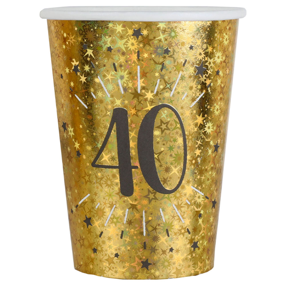 Få till en riktigt fin 40-års dukning i holografiskt guld med hjälp av dessa snygga engångsmuggar! Läckra pappmuggar som snabbt och enkelt får till den rätta stämningen. Ett perfekt val för dig som önskar fira med en snygg dukning och en strålande 40-års fest i guld.
