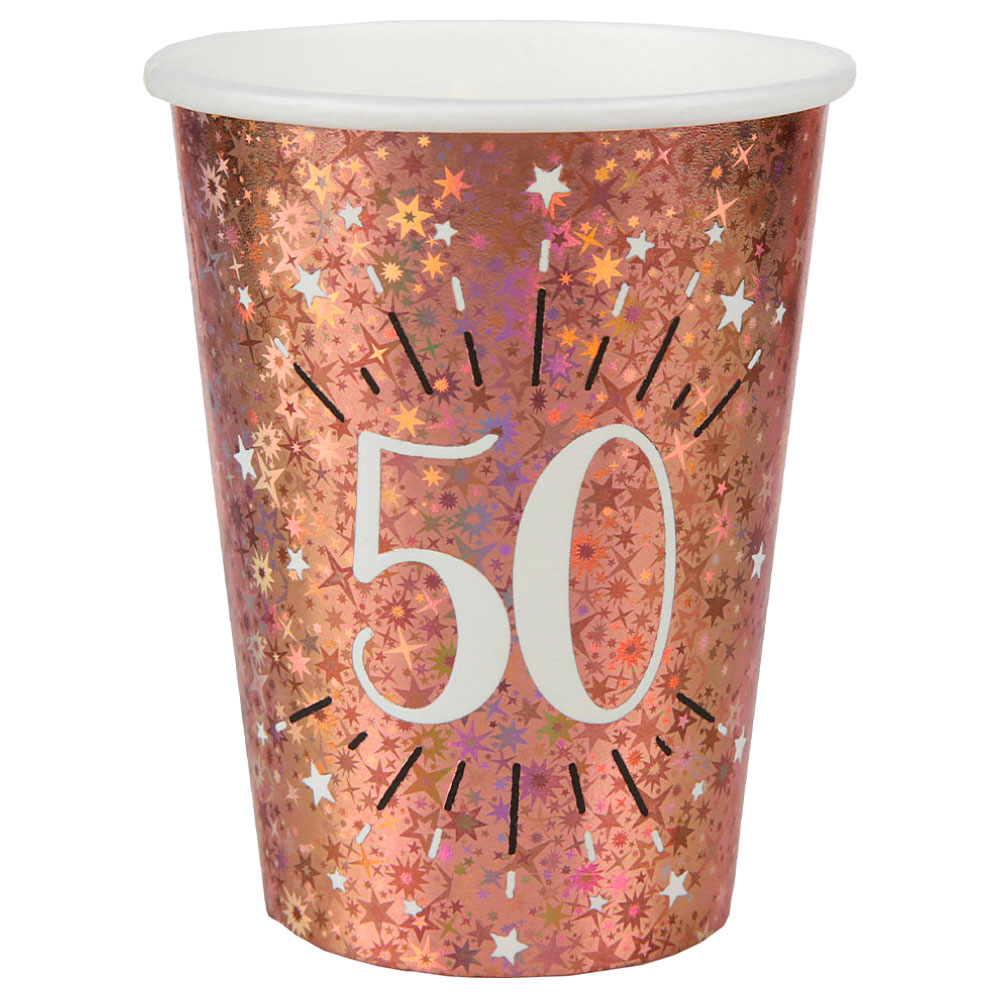 Få till en riktigt snygg, roseguldig dukning till din 50-års fest med hjälp av dessa tjusiga engångsmuggar! Holografiskt skimrande pappmuggar med 50-års motiv som blir en riktigt stämningshöjande detalj till din fest-dukning. Komplettera med andra holografiska tillbehör och få till en strålande dukning på nolltid.