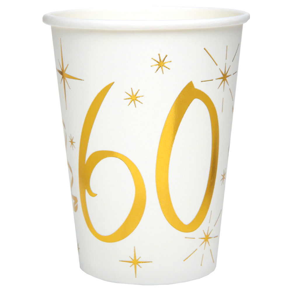Duka upp en festlig dukning inför kommande 60-års fest med hjälp av dessa fina engångsmuggar. Snygga pappersmuggar i vitt med detaljer i skimrande guld som får dukningen att se riktigt inbjudande ut. Passande pappmuggar till alla 60-års dukningar i vitt och guld.