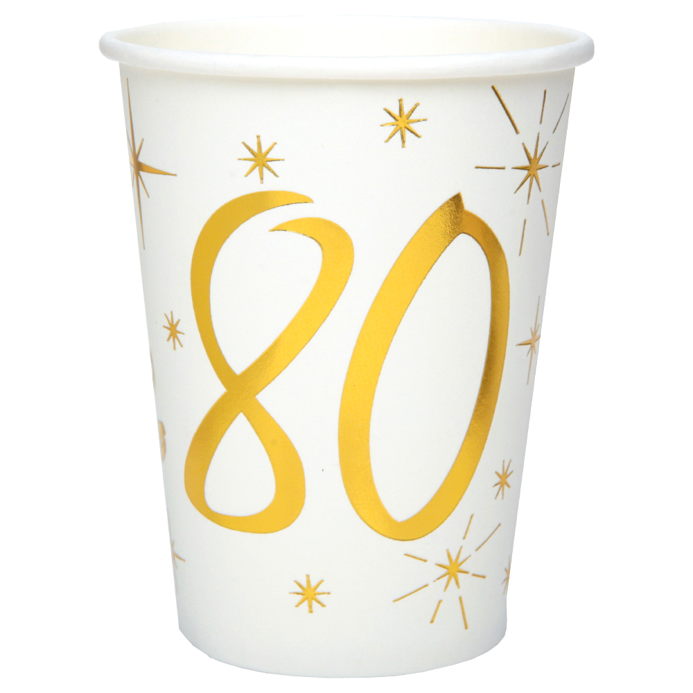 Vitt och guld är ett festligt färgtema som alltid blir en succé, och med dessa fina pappersmuggar kan du enkelt duka upp en fin 80-års dukning i den snygga färgkombinationen. Stämningshöjande engångsmuggar som låter dig enkelt duka upp bordet inför 80-års fest. Helt enkelt perfekta pappmuggar för varje 80-års kalas!