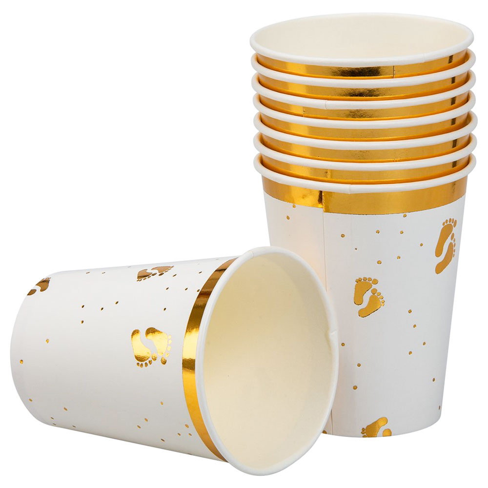 Pappmuggar Baby Fötter omfattar ett 8 pack engångsmuggar i vitt med guldiga prickar och motiv av bebis-fotspår. Muggarna är tillverkade av papp och är ca 9 x 7,5 cm stora.