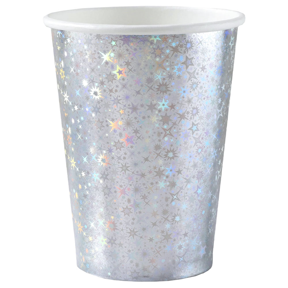 En skimrande silver dukning med glänsande holografisk effekt kan kanske låta lite avancerat, men med dessa fina engångsmuggar blir det i själva verket lätt som en plätt. Skimrande pappersmuggar med fina stjärnmotiv som glänser i regnbågsens alla färger. Duka upp dessa pappmuggar med andra holografiska tillbehör och få till en riktigt strålande kalasdukning som definitivt imponerar på alla dina gäster!