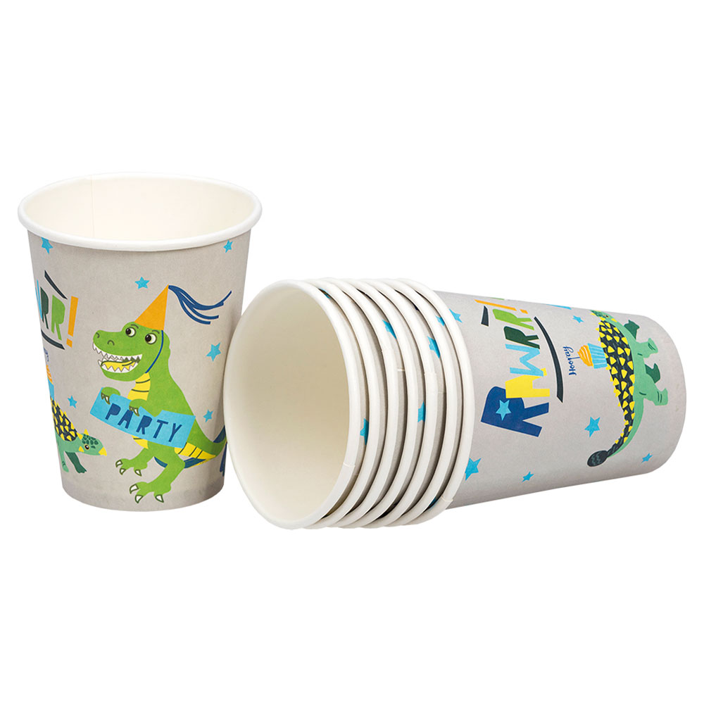Pappmuggar Dinosaur Party omfattar ett 8-pack engångsmuggar med dinosauriemotiv. Muggarna är tillverkade av papp och är ca 9,5 cm höga.