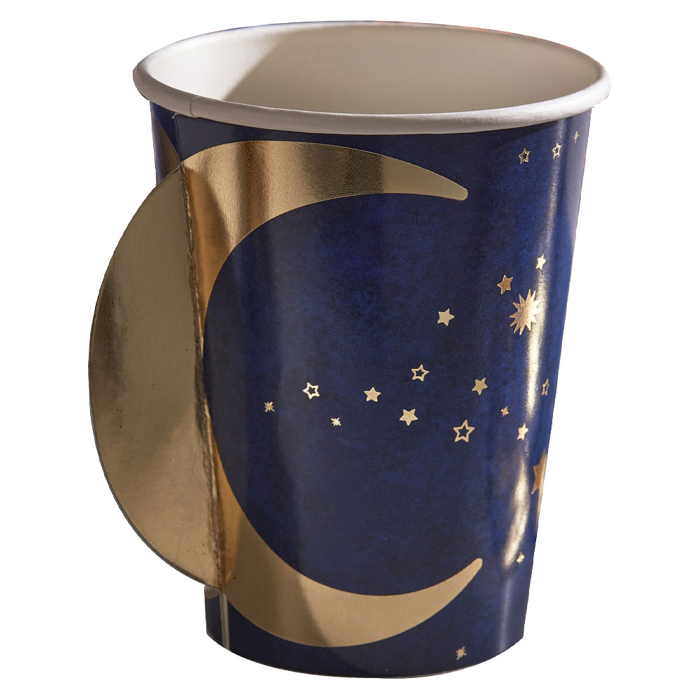 Pappmuggar Eid omfattar ett 8-pack mörkblåa engångsmuggar med guldigt utstickande motiv av en måne samt små stjärnmotiv i guld. Muggarna är tillverkade av papp och rymmer ca 266 ml.
