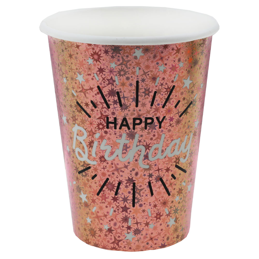 Pappmuggar Happy Birthday Party Roseguld omfattar ett 10-pack roseguldiga engångsmuggar med holografiskt skimmer och dekorativ "Happy Birthday" text framtill. Muggarna är tillverkade av papp och är ca 9,5 cm stora.