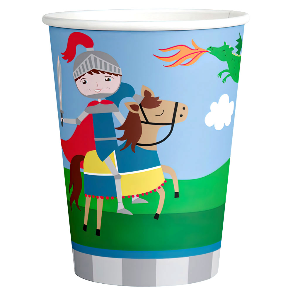 Pappmuggar Knight omfattar ett 8-pack engångsmuggar med färgglada motiv av en riddare på en häst och eldsprutande drake. Muggarna är tillverkade av papp och rymmer 250 ml.
