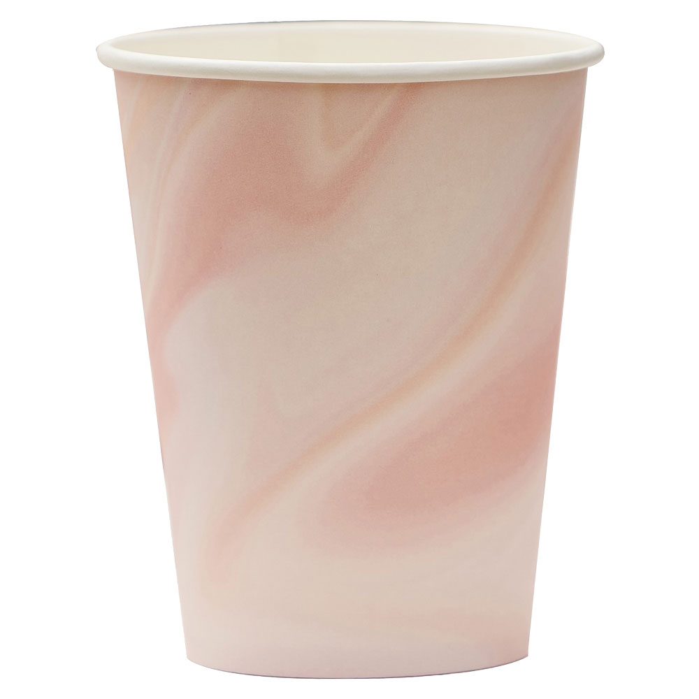 Pappmuggar Pink Party omfattar rosa engångsmuggar av papp med dekorativt marmormönster. Muggarna kommer i 8-pack och rymmer ca 266 ml. Engångsmuggarna är även återvinningsbara.