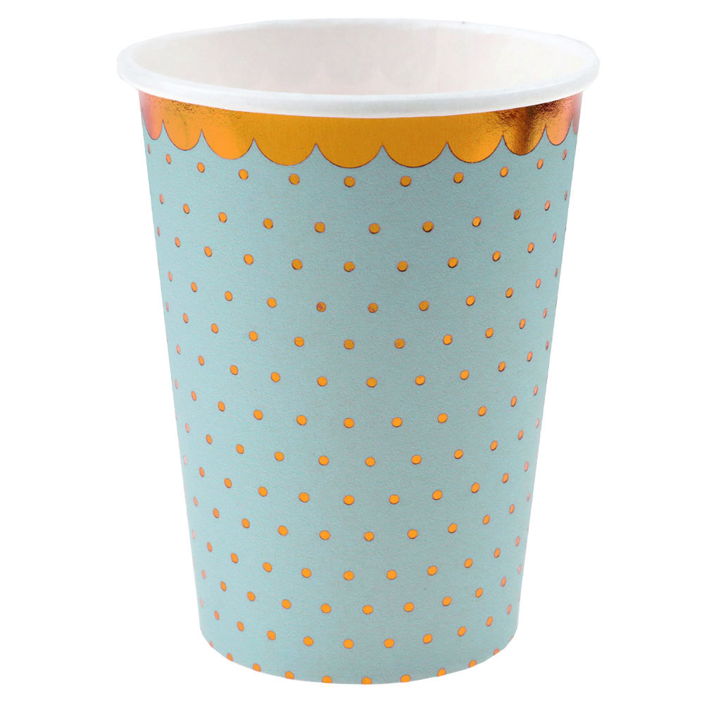 Pappmuggar Prickar Guld/Ljusblå omfattar ett 10-pack ljusblåa engångsmuggar med guldprickar. Muggarna är tillverkade av papp och är ca 9,5 cm stora.