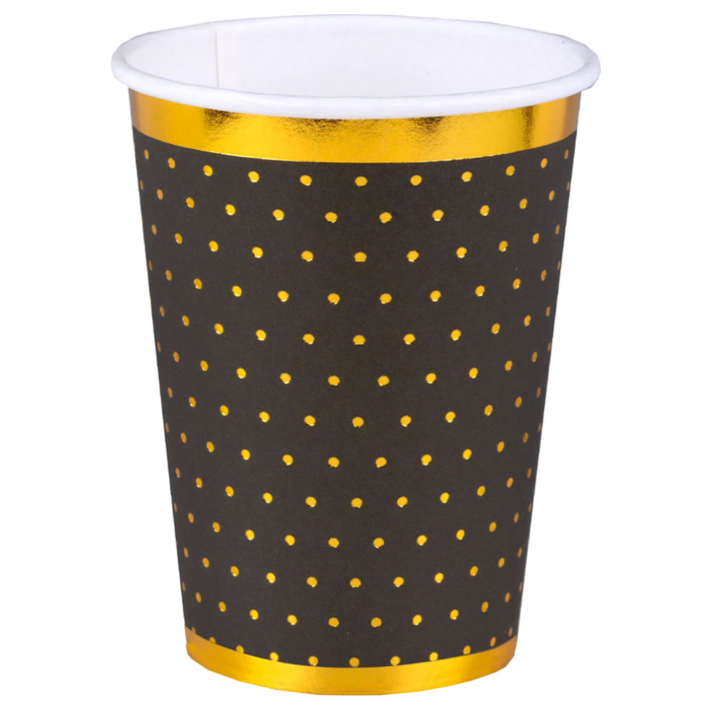 Liva upp kalasbordet med dessa fina engångsmuggar! Snyggt svarta pappmuggar med guld-skimrande prickar som får dem att se riktigt festliga ut. Passande pappersmuggar till förslagsvis födelsedagar, nyår och firanden i svart och guld.