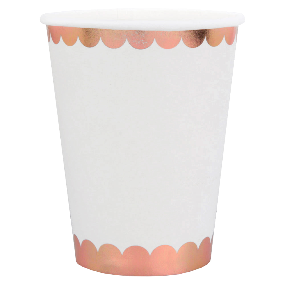 Pappmuggar Scalloped Roseguld omfattar 10 st vita engångsmuggar med dekorativa kanter i skimrande roseguld. Muggarna är tillverkade av papp och är ca 9,5 cm stora.