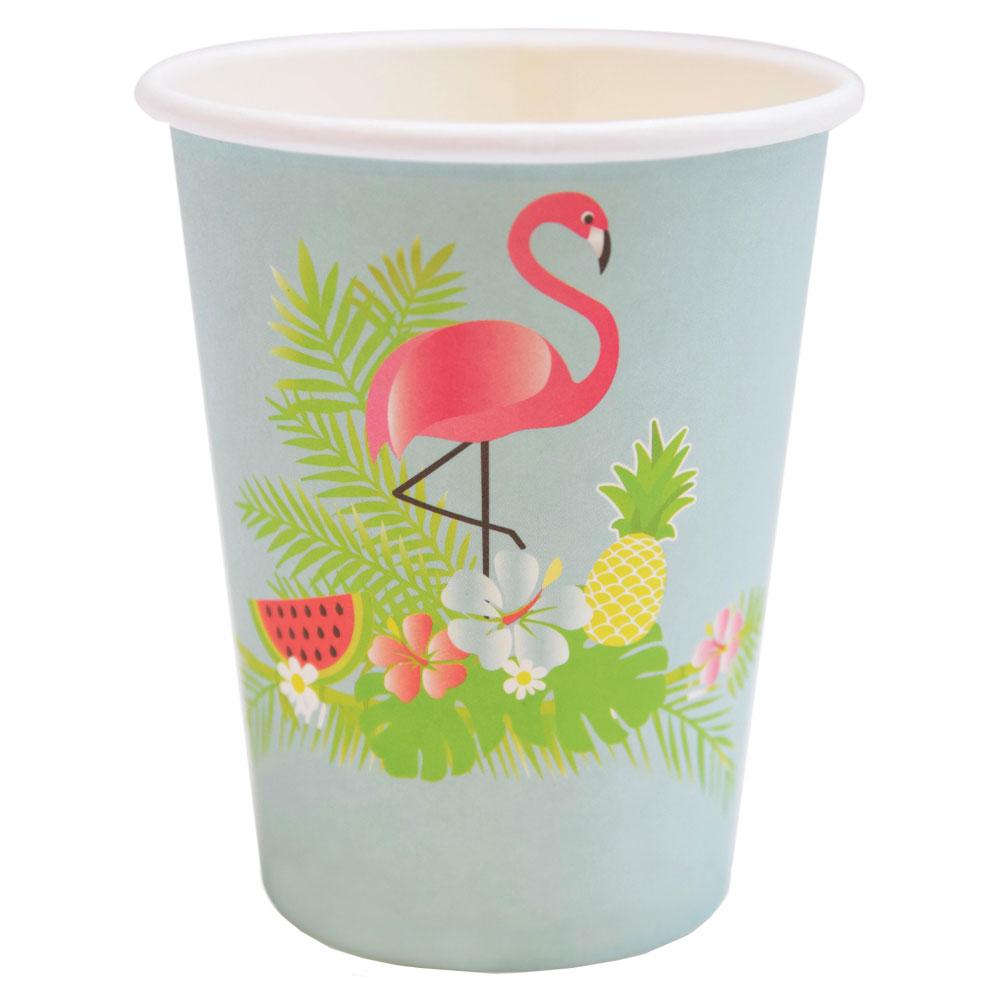 Pappmuggar Summer omfattar åtta stycken muggar i ljusblå papp med sommarmotiv i form av en rosa flamingo, frukter och blommor. Muggarna rymmer ca 25 cl och är ca 9 cm höga.