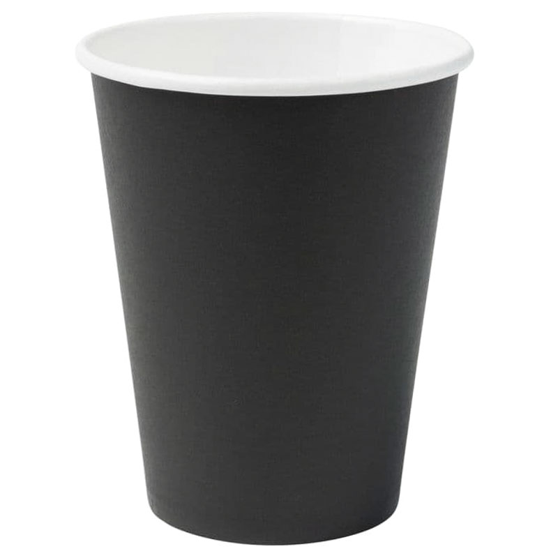 Pappmuggar Svart omfattar engångsmuggar i svart papp. Muggarna rymmer ca 250 ml och är ca 8,5 cm höga. Säljs i 8-pack.
