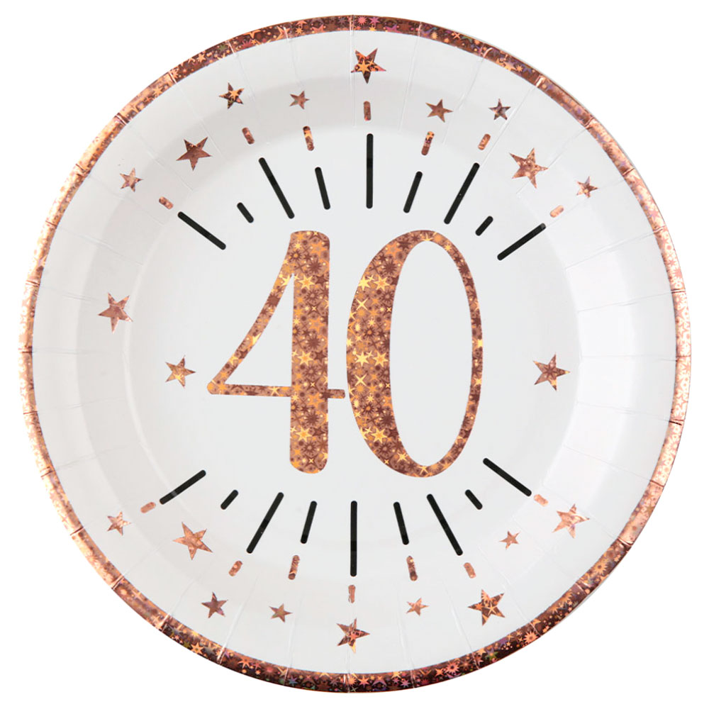 Ska du bjuda in till 40-års fest i vitt och roseguld och vill duka upp en matchande dukning till firandet så är dessa 40-års tallrikar det rätta valet för dig. Superfina 40-års tallrikar i vitt och roseguld som tveklöst gör din födelsedagsdukning riktigt snygg. Med dessa tallrikar blir din dukning mer än redo för 40-års fest!