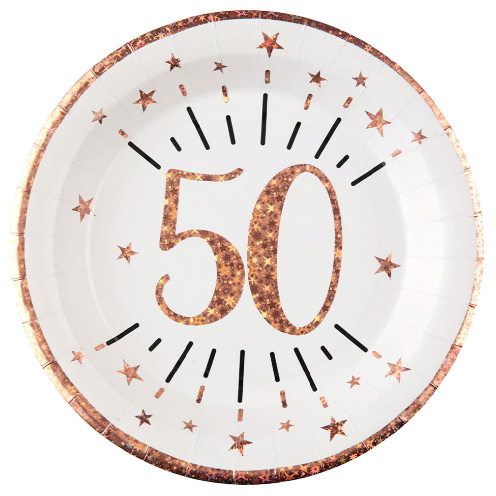 En snygg dukning till din 50-års födelsedag blir riktigt enkelt att få till med hjälp av dessa snygga 50-års fest tallrikar! Dekorativa 50-års tallrikar som blir ett snygg inslag till varje födelsedags-dukning i vitt och roseguld. Med dessa 50-års fest tallrikar blir din dukning riktigt fin!