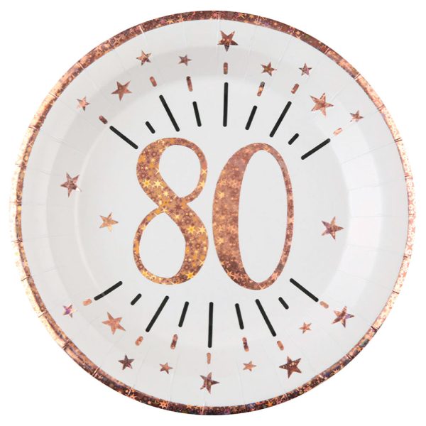 Vill du duka upp en fin dukning i vitt och roseguld till din 80-års födelsedag så är dessa snygga engångstallrikar precis vad du behöver. Riktigt fina 80-års tallrikar som får hela din födelsedagsdukning att stråla. Ett perfekt val för alla som ska fylla 80 och vill fira med en proffsig dukning som skruvar upp stämningen till max.
