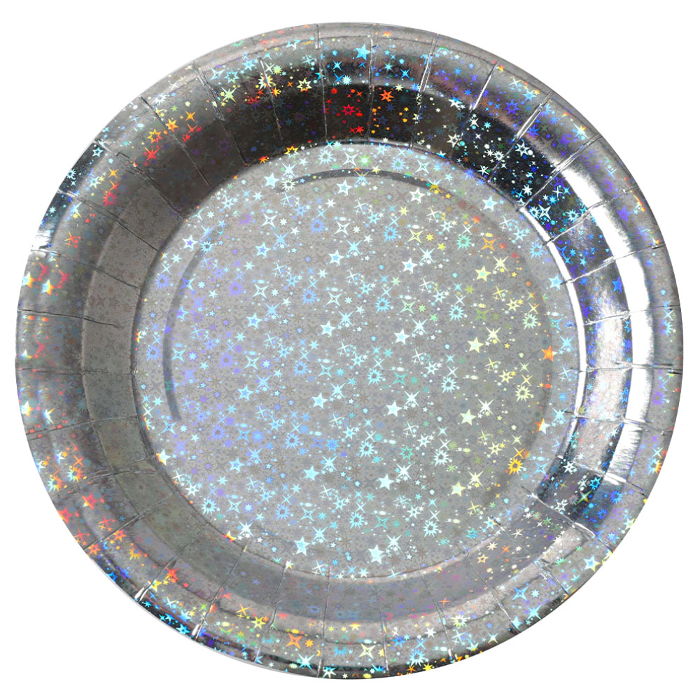 Papptallrikar Birthday Party Silver omfattar ett 10-pack silvriga engångstallrikar med holografisk effekt. Tallrikar är tillverkade av papp och är ca 22 cm stora.