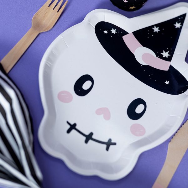 Papptallrikar Dödskalle med Hatt omfattar sex stycken engångstallrikar med motiv av en gullig dödskalle med en häxhat.