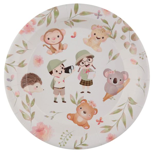 Duka inför safari kalas med dessa fina papptallrikar! Dekorativa engångstallrikar med motiv av två små barn på safari bland massor av olika djur, vilket passar perfekt till kalas i både safari- och djur-tema. Med dessa safari tallrikar kan du alltså enkelt duka upp i ett riktigt häftigt tema inför ditt djur-kalas.