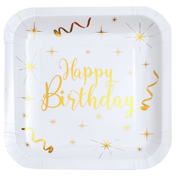 Papptallrikar Happy Birthday Sparkle omfattar ett 10-pack fyrkantiga engångstallrikar i vitt med "Happy Birthday" text och dekorativa motiv av stjärnor och serpentiner i guld. Tallrikarna är tillverkade av papp och är ca 23 x 23 cm stora.