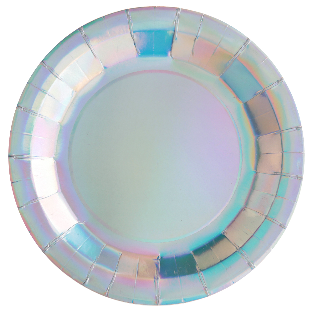 En strålande dukning som nästan bländar gästerna med sin fantastiska glans kan utlovas med dessa snygga Iridescent Silver papptallrikar! Duka upp dessa papperstallrikar och låt dem bli en utstickande detalj eller matcha dem med andra regnbågsskimrande tillbehör för en extra festlig look. Häftiga engångstallrikar som passar lika bra till allt från sagolika sjöjungfru eller unicorn kalas till festliga disco eller regnbågs-fester.