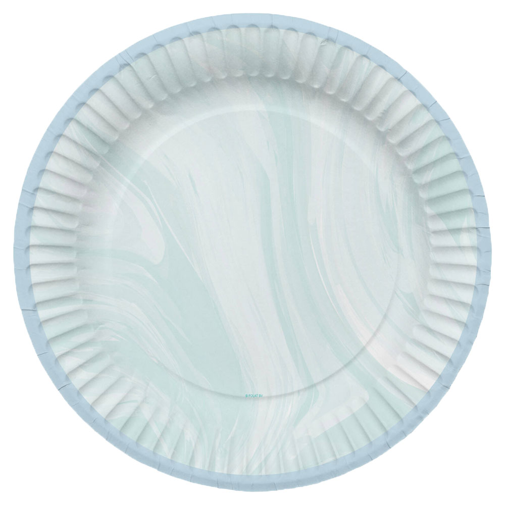 Papptallrikar Marble Blue omfattar 8 st engångstallrikar av papp med ljusblått marmormönster. Tallrikarn är ca 23 cm stora.