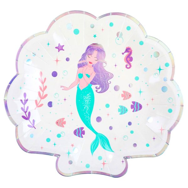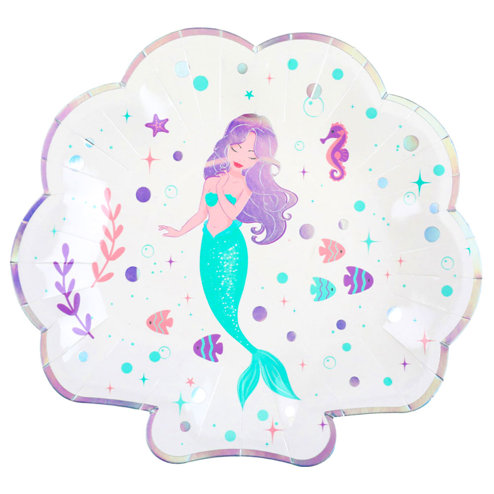Papptallrikar Mermaid Party omfattar ett 10-pack, vita engångstallrikar i form av snäckskal med fint sjöjungfrumotiv och regnbågsskimrande detaljer. Tallrikarna är tillverkade av papp och är ca 20,5 cm höga samt 22 cm breda.