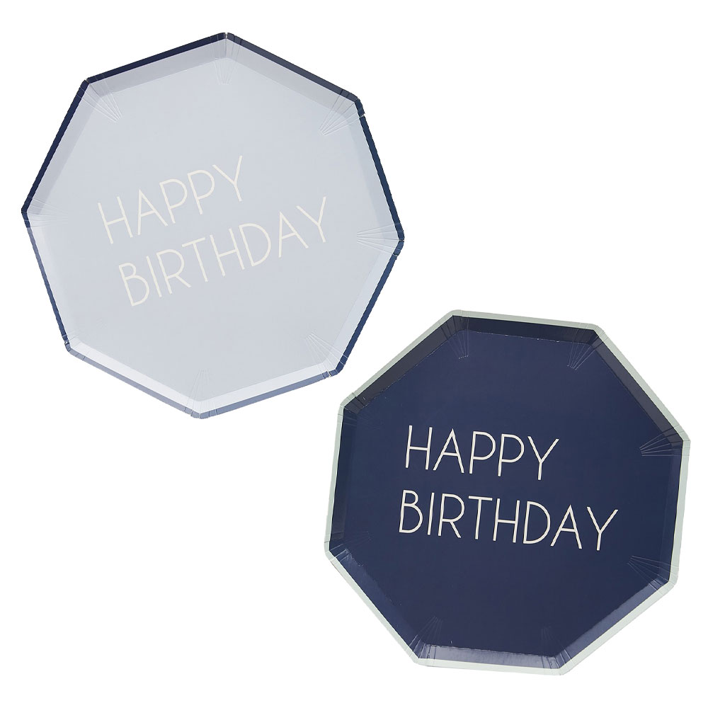 Papptallrikar Mix It Up Navy omfattar ett 8-pack åttakantiga engångstallrikar i marinblått och pastellblått. Tallrikarna är även försedda med vit "Happy Birthday" text och är ca 25 cm stora. Tillverkade av återvinningsbart papp.