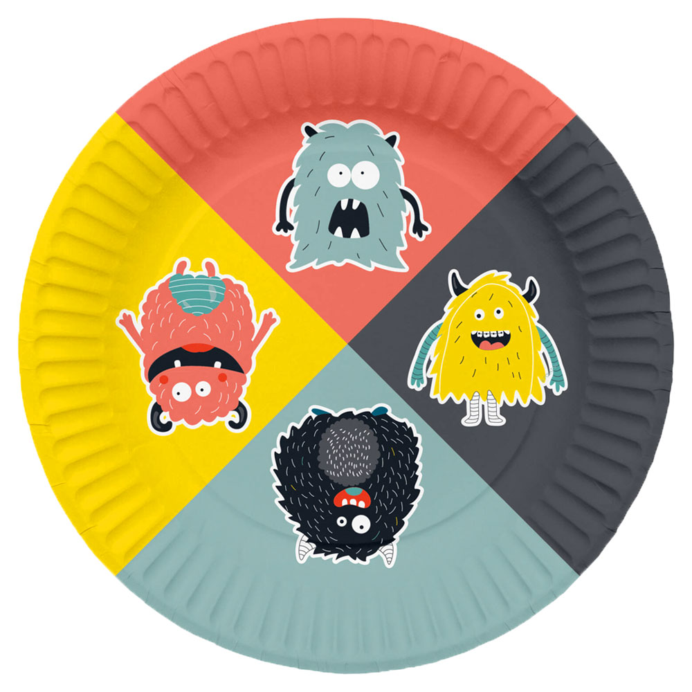 Papptallrikar Monster Bash omfattar 8 st engångstallrikar med motiv av glada monster mot en flerfärgad bakgrund. Tallrikarna är i papp och mäter ca 23 cm i diameter.