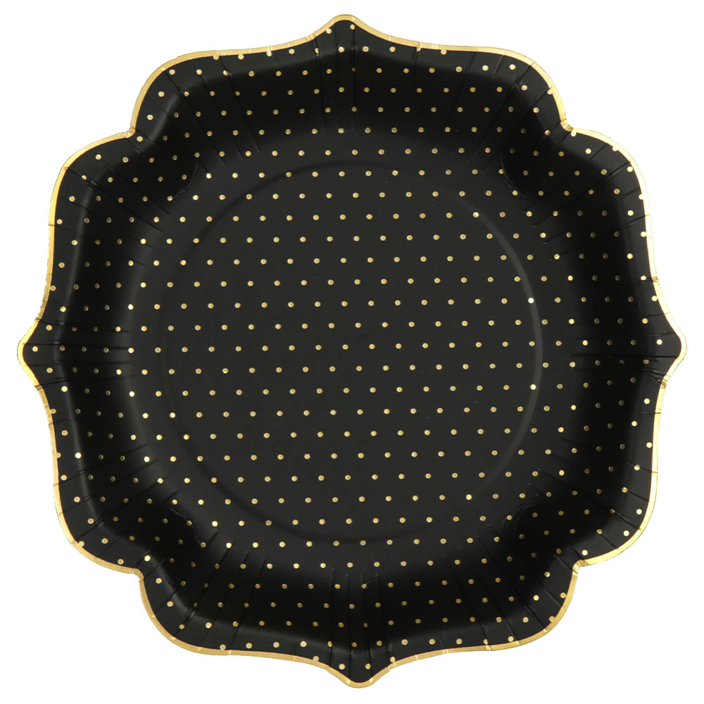 Papptallrikar Prickar Svart och Guld omfattar ett 10-pack svarta engångstallrikar med guldiga kanter och guldiga prickar. Tallrikarna är tillverkade av papp och mäter ca 21 x 21 cm.