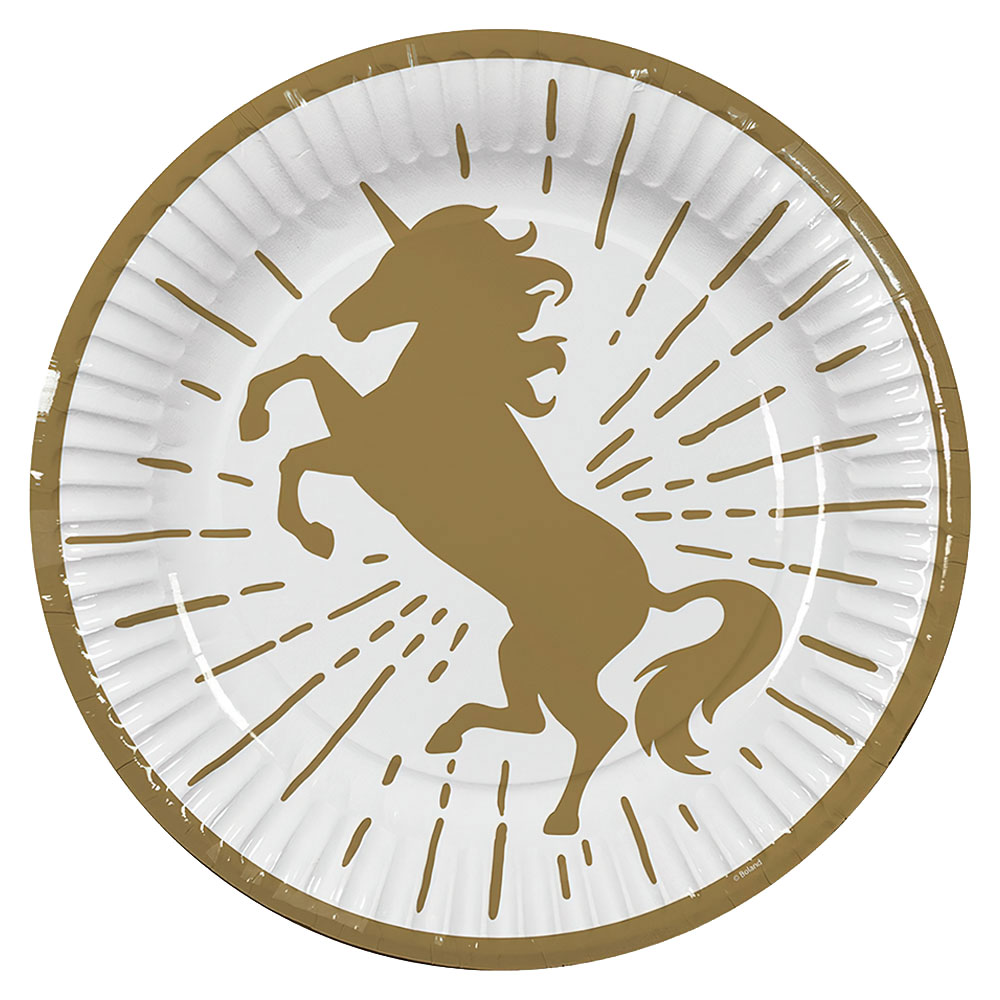 Papptallrikar Unicorns omfattar tallrikar i vitt med guldkant, gulddetaljer och motiv av en stor guldig enhörning. Tallrikarna är i papp och är ca 23 cm stora. Säljs i 10-pack.