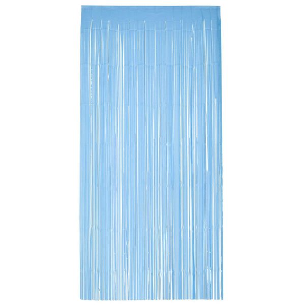 Party Draperi Matt Babyblå omfattar ett draperi med långa fransar i en matt babyblå färg som kan användas t.ex. i dörröppningar eller som väggdekoration.