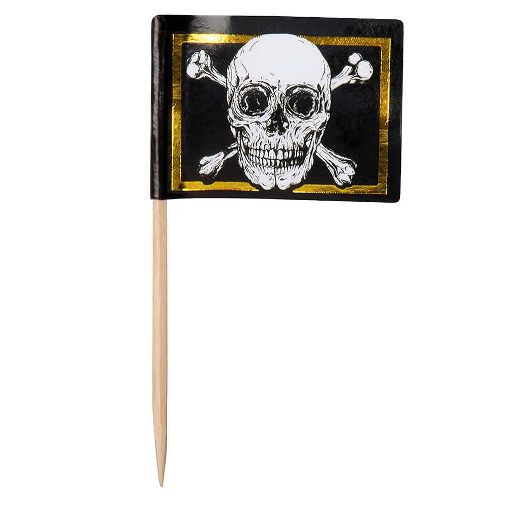 Party Picks Döskalle med Guldkant består av ett paket med 24 stycken partypicks med en liten piratflagga med guldkant på.