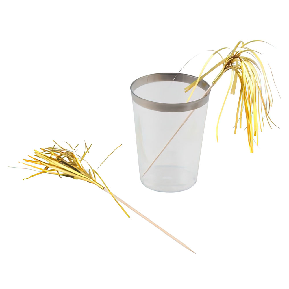 Tjusiga långa cocktailpinnar i trä med snygga guldfransar, perfekt till drinkar och läcker mat, riktigt fina drinkpinnar och dekoration som passar utmärkt till nyår och andra festligheter. Dessa guldiga party picks och drinkpinnar bjuder på härlig fest stämning och kalasdukning hela kvällen lång.