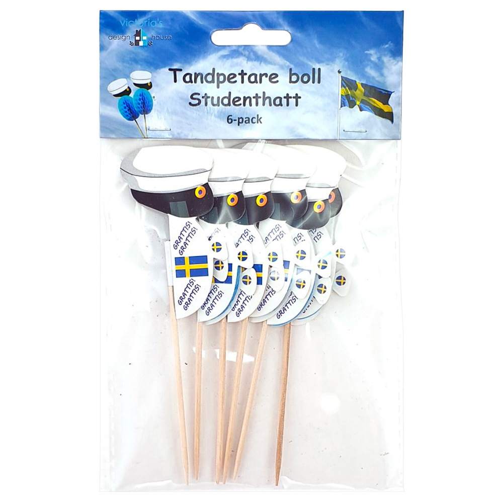 Party Picks Studentmössor omfattar tandpetare i trä med motiv av studentmössor i papp och mönstrat utvikbart papper i blått. Tandpetarna är ca 14 cm höga inklusive motiv och säljs i 6-pack.