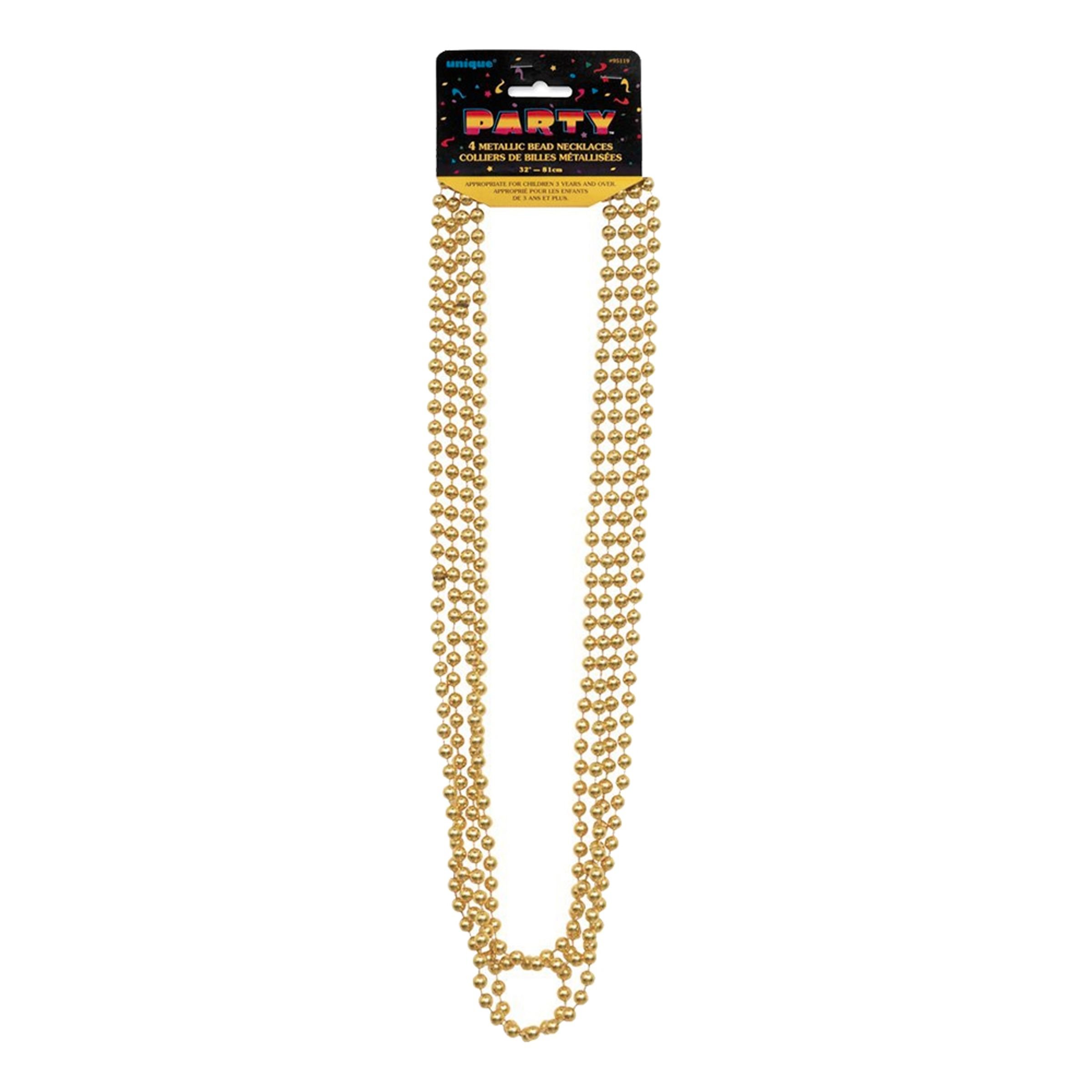 Partybeads Guld Metallic är ett 4-pack med guldhalsband som kan användas vid festliga tillfällen. Varje halsband har en längd på 81 cm vilket gör att de hamnar en bit ner på bröstet. De kan till exempel komma till nytta på en möhippa, maskerad eller tema-fest.