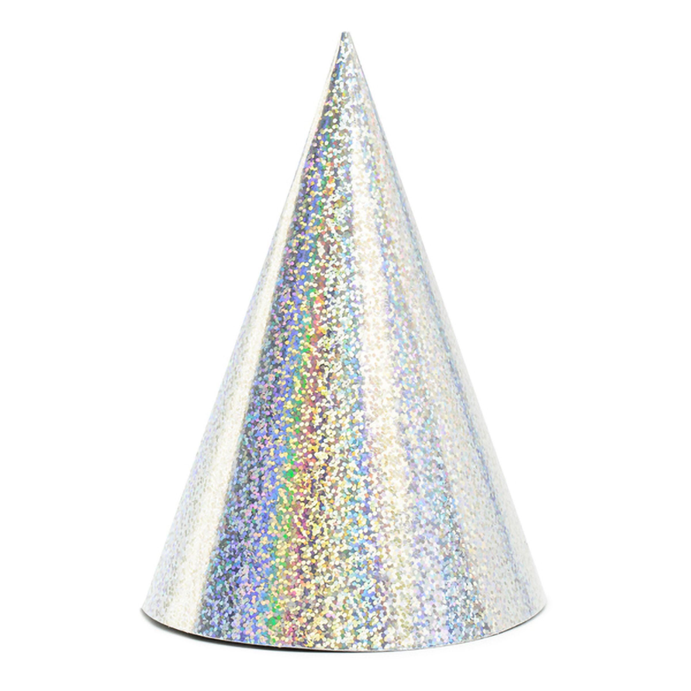 Partyhattar Holografiska Silver inkluderar sex stycken konformade partyhattar som glimrar och skimrar med sin häftiga holografiska yta i silver. Sitter på plats med elastiskt snöre under hakan. Passar utmärkt till nyårsfesten!